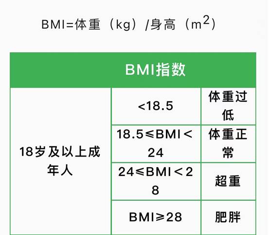 体重指数是国际通用的体重判断方法,知道了自己的身高和体重,我们可以自己判断重不重,计算公式为bmi=体重(㎏)/身高(㎡)。根据中国居民膳食指南,我国健康成年人(18~64 岁),bmi 应在 18.5~24 kg/m²。如果成年人的bmi<18.5,则体重过低;18.5≤bmi<24,体重正常;24≤bmi<28,体重超重;bmi≥28,肥胖。