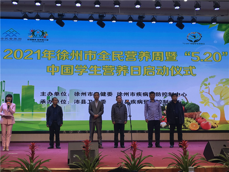为贯彻落实《“健康江苏2030”规划纲要》和《江苏省国民营养计划实施方案2018-2030)》,深入推进合理膳食行动、学生营养改善行动, 5月14日,由徐州市卫生健康委员会、徐州市疾控中心主办,沛县卫生健康委员会、沛县疾控中心承办的2021年徐州市全民营养周暨中国学生营养日启动仪式在徐州市沛县实验学校隆重举行。来自全市各县(市、区)的疾控中心分管主任、营养工作负责人、学校卫生工作负责人参加了活动。徐州市疾控中心副主任许继民、沛县卫生健康委员会副主任朱信卫、沛县市场监督管理局餐饮科科长聂金沛、沛县教育局德育办邢文生主任、沛县疾病预防控制中心主任蔡建平等领导参加了启动仪式。