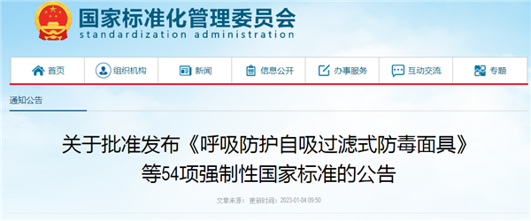 国家市场监督管理总局(国家标准化管理委员会)批准《呼吸防护 自吸过滤式防毒面具》等54项强制性国家标准-0008全讯注册